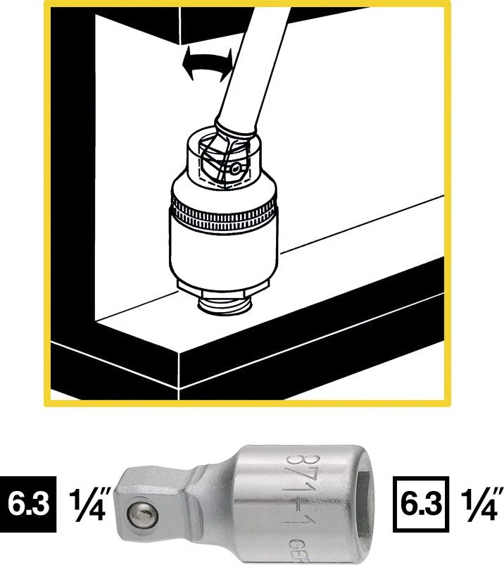 Schwenkwinkel nach jeder Seite 8° - Durch Aufstecken des Steckschlüssel-Einsatzes bis zum Anschlag kann die schwenkbare Verlängerung auch als starre Verbindung verwendet werden